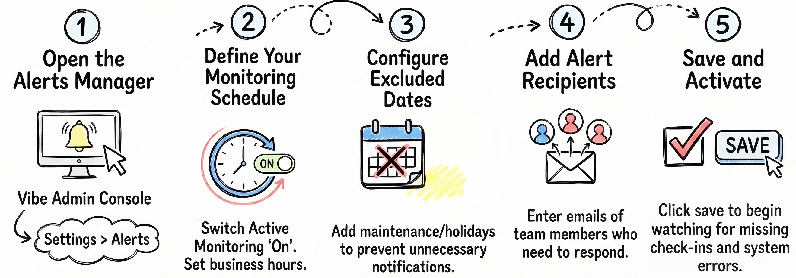 Once active, the system will watch for missing check-ins and send alerts when issues are detected.