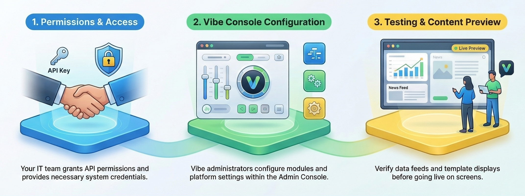 Connect collaboration tools such as Microsoft 365, SharePoint, or Google to display posts, documents, calendars, or internal updates on Vibe screens. - Data & Analytics Platforms