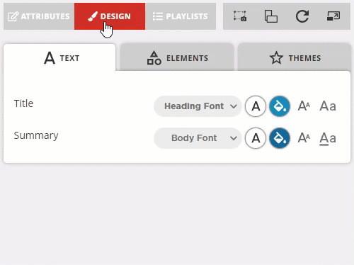 - Adjust the available fields within the Text, Elements and Themes tabs