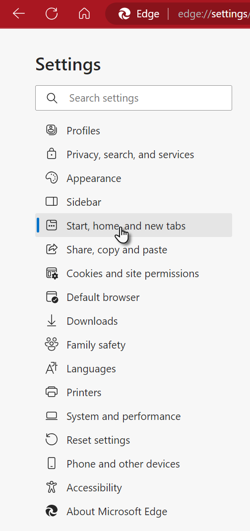 2. Select Start, home, and new tabs