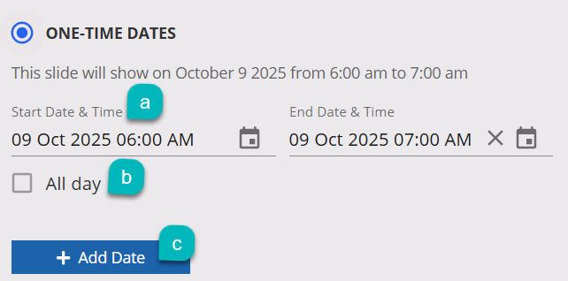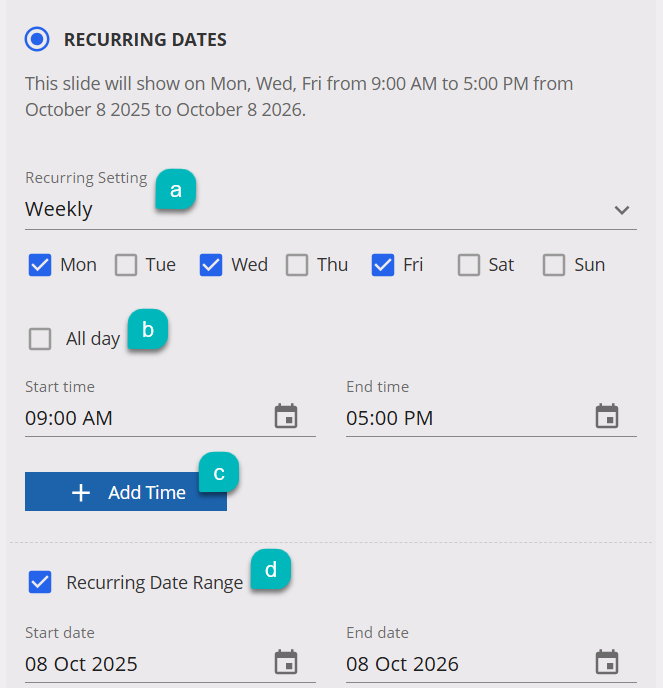 Perfect for high-priority or time-sensitive messages without risk of accidental repeats. Use this option for events or announcements that happen on a specific date and time.