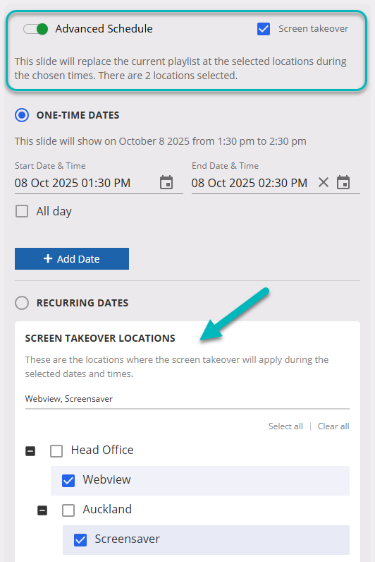 Get the Timing Right. With Vibe’s Advanced Schedule, you can decide exactly when and how often your slide appears.