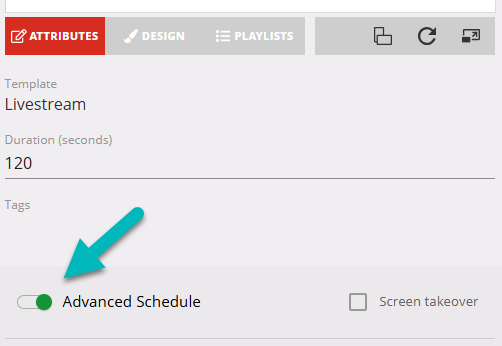 In the slide editor, open the Attributes tab and enable Advanced Schedule.