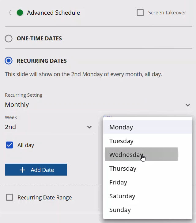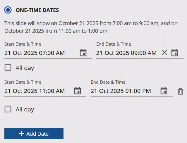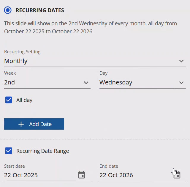 Example: This slide will show on the 2nd Wednesday of every month, all day from October 22 2025 to October 22 2026.
