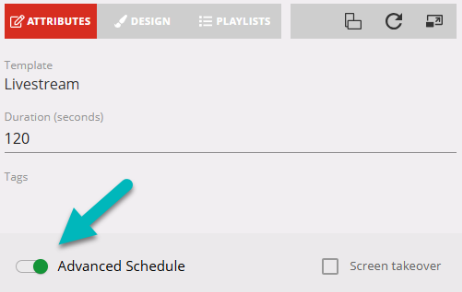 In the Slide Editor, go to the Attributes tab and toggle on Advanced Schedule — just make sure your content is ready to go first!