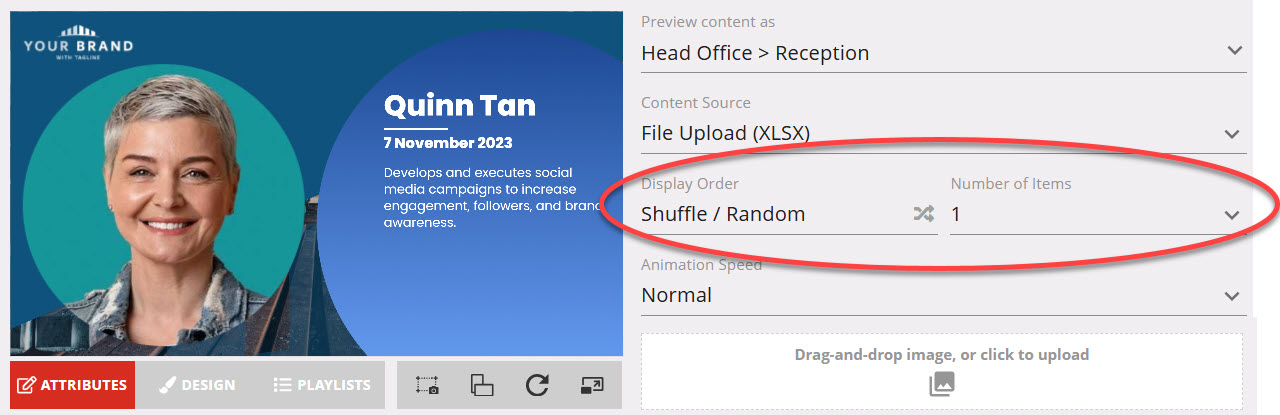 Example: Preloaded internal communications content, with a Random Display Order and Number of Items limited to show one message each time the slide is seen on screen.