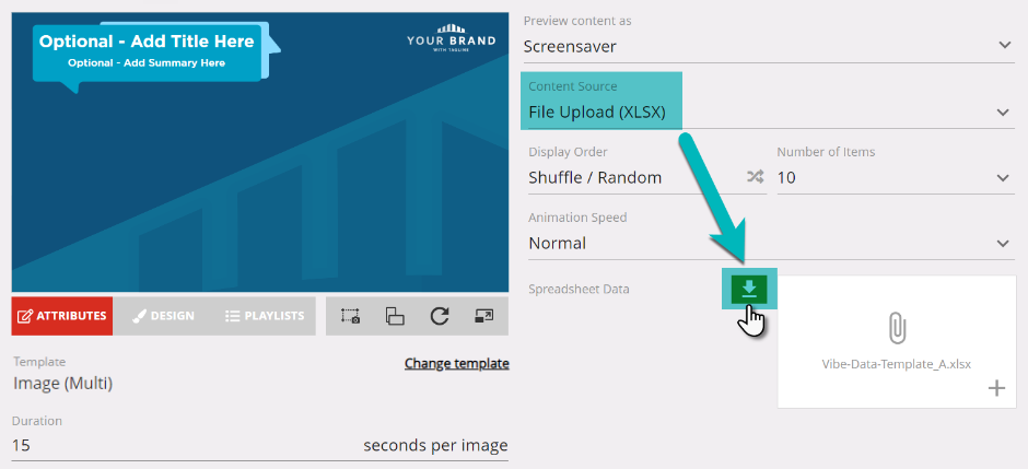 - Vibe Portal - In the slide editor, choose SharePoint (XLSX) in the Content Source dropdown and select your saved Excel file.