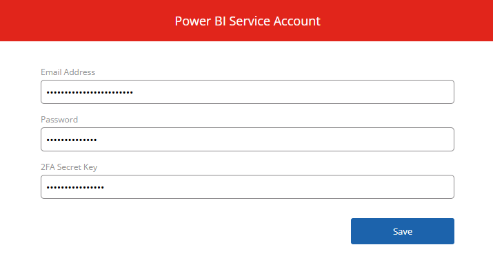 - Input the following information to the Power BI Service Account page and click Save: