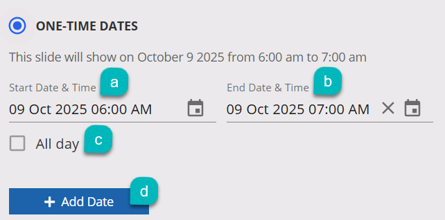 Perfect for time-sensitive or event-based messages. Use this option to set one or more specific dates and times for your takeover to run (e.g. schedule your takeover at 1pm and 3pm on the same day, or repeat on multiple selected dates.